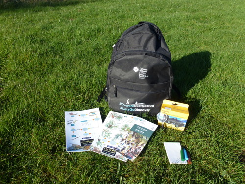 Mae pob gwarbac darganfod yn cynnwys pethau da a defnyddiol fel ysbienddrych, chwyddwydr, pot chwilod a chardiau adnabod natur, ynghyd â chanllaw yn egluro sut i'w defnyddio.